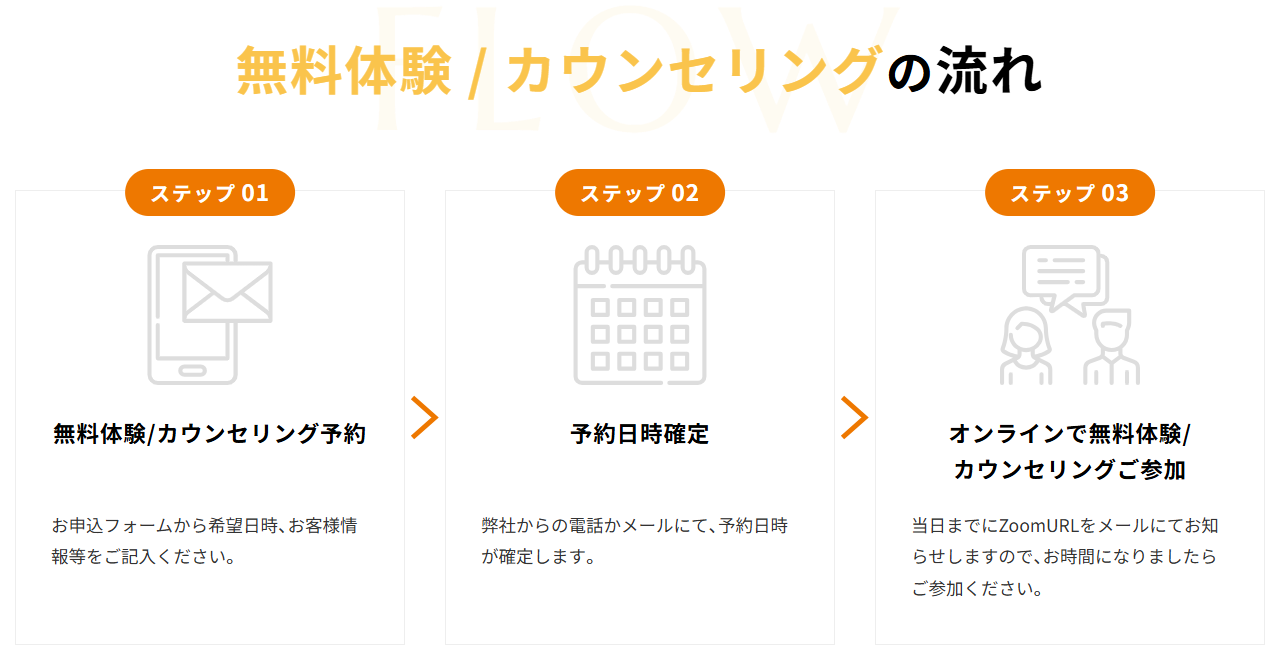 サービスはオンラインで完結するため、場所を選ばず、自分のペースで取り組むことができます。対面だと緊張しやすい方でも、慣れた環境から利用できるため、落ち着いて話しやすい点がメリットです。予約から利用までの流れも分かりやすく、初めてでも気軽に利用できます。