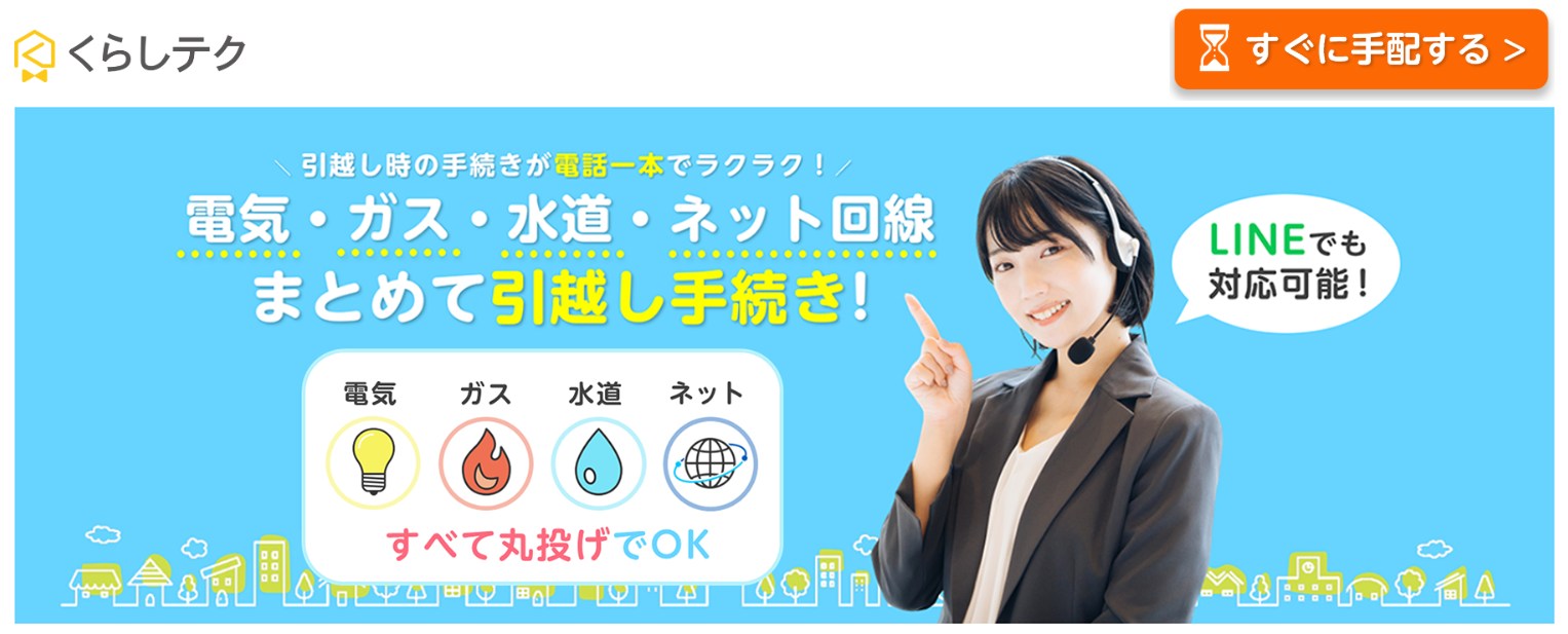 引越しの際によくあるのが「ガスの停止を忘れていた」「ネット回線を早めに申込まなかったために、しばらく使えなかった」といったトラブルです。くらしテクにまとめて依頼しておけば、必要な手続きをスムーズに進められ、ライフラインの未手続きによる不便を防げます。