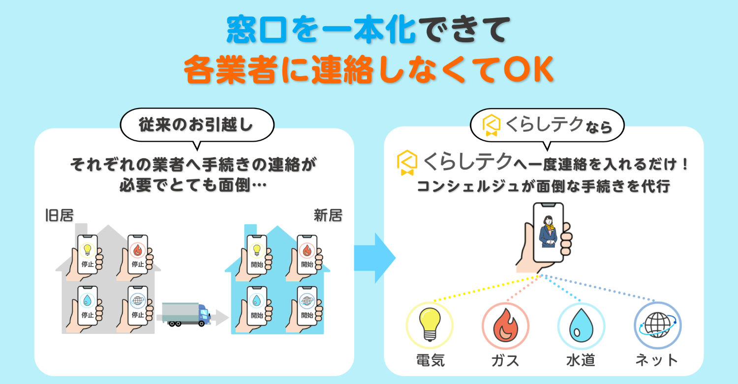 引越しの準備で最も面倒なのが、電気・ガス・水道・インターネット回線といったライフラインの手続きです。転居前に停止手続き、転居先では開始手続きが必要となり、それぞれ別の窓口に連絡しなければなりません。忙しい時期に複数の会社へ電話したり、申込みフォームを探したりするのは大きな負担となります。そんな煩雑な手続きをまとめて一本化できるのが、引越し手続きサポートサービス「くらしテク」です。