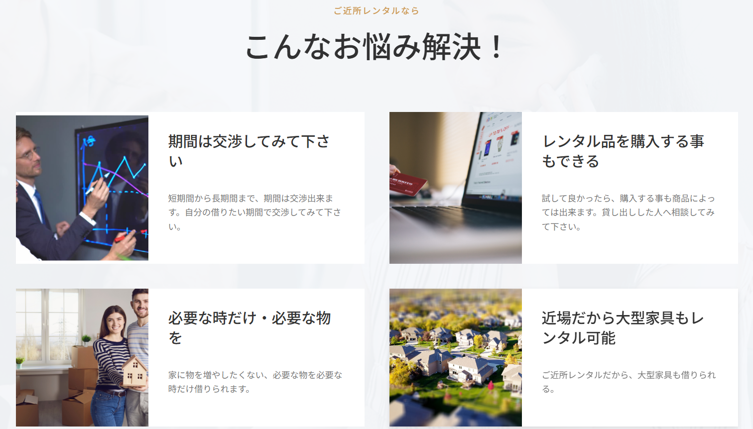 ご近所レンタルは、物を増やさずに生活の質を上げられるため、これらのニーズにピッタリと寄り添っています。また、必要なアイテムを地域でシェアできることで、災害時の備えとしても役立つなど、幅広い価値を提供しています。