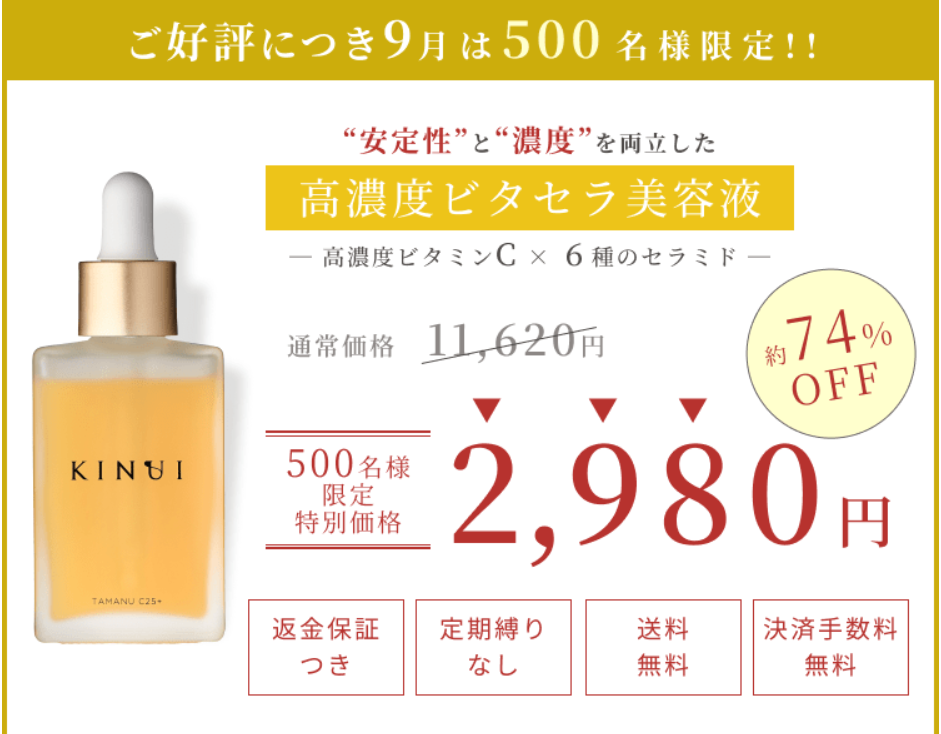 そんな方に注目されているのが、高濃度ビタミンC誘導体とセラミドを組み合わせた美容液【KINUI(キヌユイ)C25 リッチセラム】です。