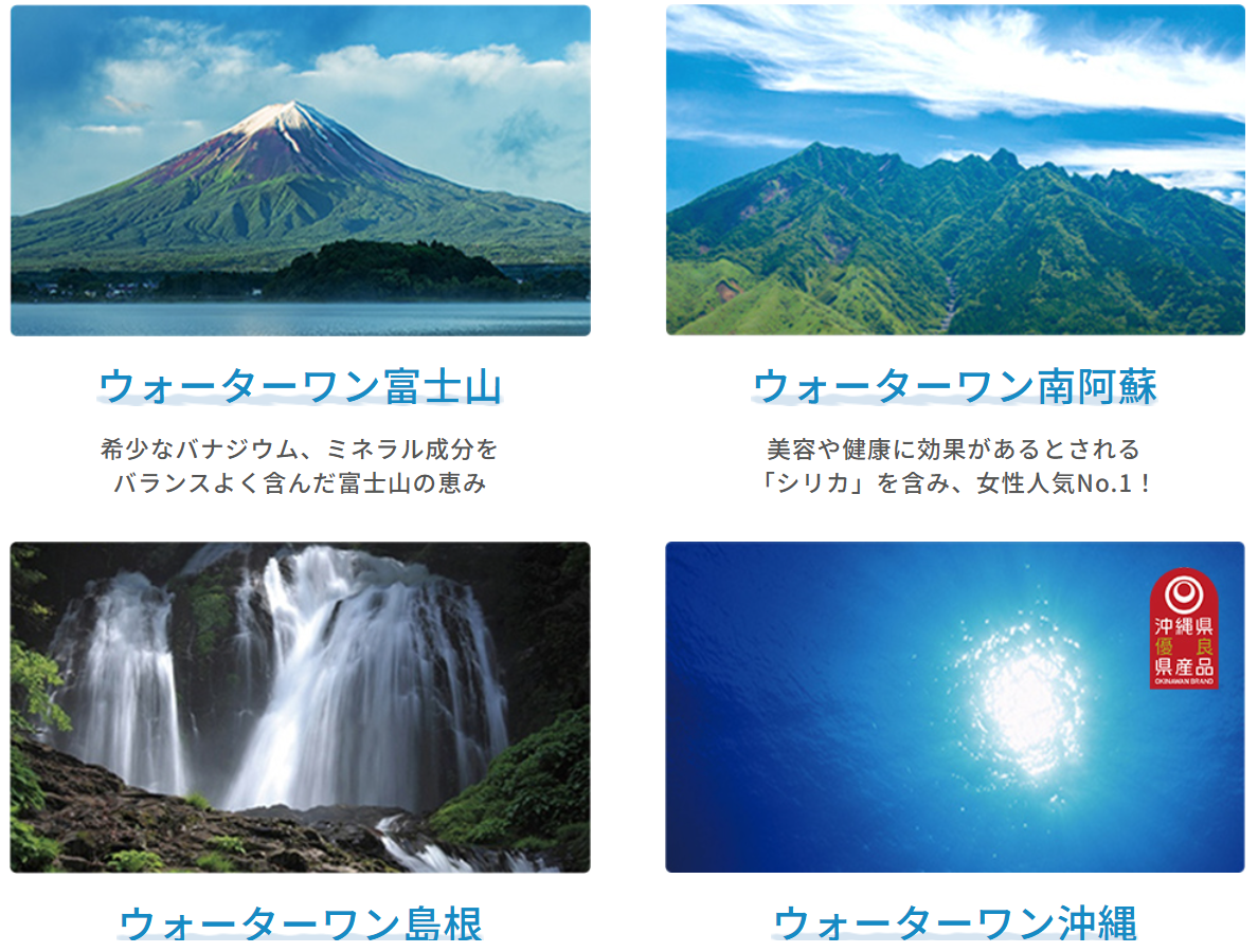ウォーターワンでは、富士山・南阿蘇・沖縄・島根といった、日本各地の自然豊かな採水地から天然水を提供しています。それぞれの地域の地層や環境によって、ミネラルバランスや口当たりに違いがあり、好みに合わせて選べる点が魅力です。