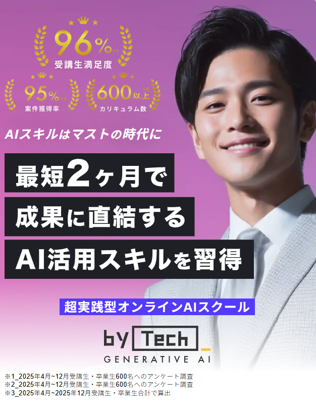 バイテック生成AIは、初心者でも安心して学べる環境と、実践で使えるスキル習得に特化したオンラインスクールです。