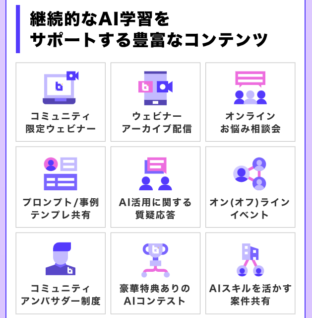 生成AIの基礎知識から、プロンプト設計、業務効率化への応用、さらには生成AIを活用した収益化の考え方まで、段階的に学べるカリキュラムが用意されています。