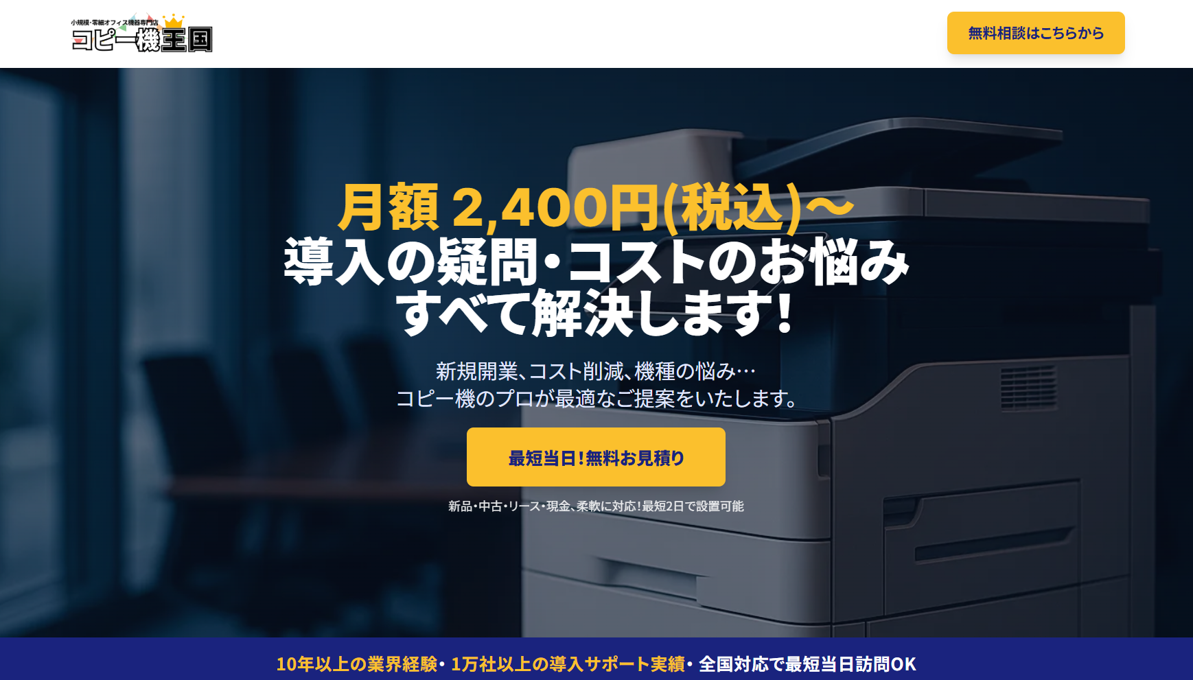 そんな悩みを一気に解決してくれるのが、月額2,400円(税込)から利用できるコピー機サービス【コピー機王国】です。すでに1万社以上の導入サポート実績を誇り、コスト・品質・サポートのバランスに優れたサービスとして、多くの事業者から選ばれています。