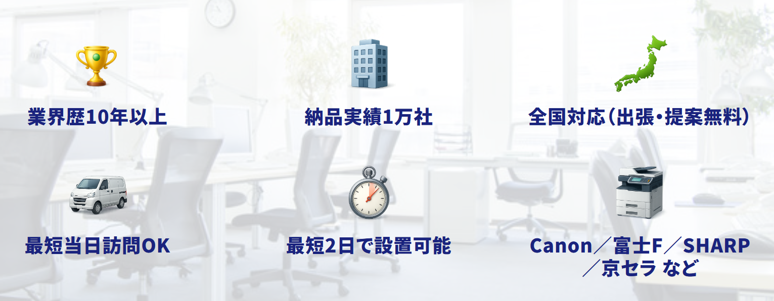 コピー機にかかる無駄なコストや手間を減らし、オフィス環境をスマートに整えたい方は、ぜひ一度検討してみてはいかがでしょうか。コスト削減と業務効率化、その両方を実現したい方に自信をもっておすすめできるサービスです。