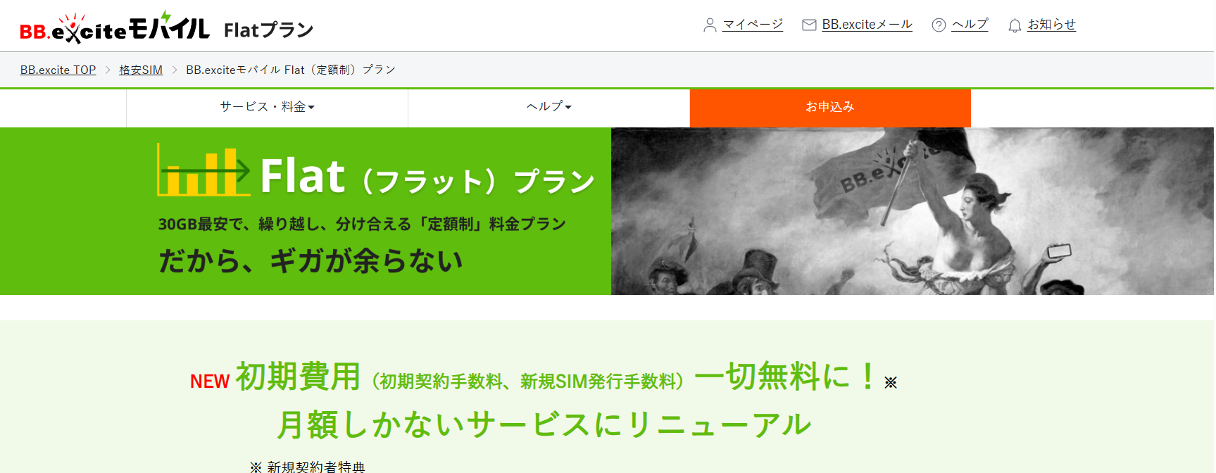 【BB.exciteモバイル/Flatプラン】は、「月額しかいらない」というコンセプトのもと、定額制で分かりやすく使える格安SIMです。
