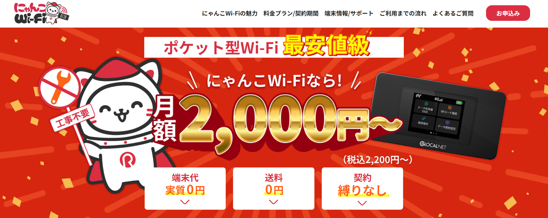 【にゃんこWi-Fi】の最大の特長は、月額2,000円(税込2,200円)から利用できるリーズナブルな料金設定と、契約期間の縛りがない点です。
