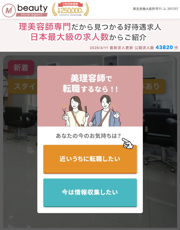 BeautyMiraiは、美容師・理容師の資格を持つ方に特化した求人・転職支援サービスで、業界に精通した専任アドバイザーがあなたに合った職場探しをサポートしてくれます。